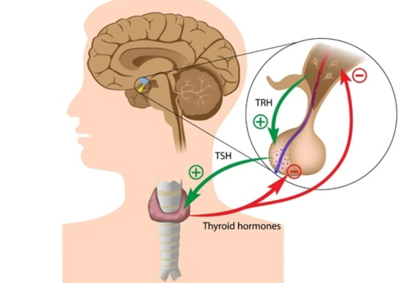 Podwzgórze wydziela hormon tyreoliberynę (TRH), a ta z kolei jest odpowiedzialna z wydzielanie tyreotropiny (TSH) – hormonu, który stymuluje tarczycę do produkcji T3 i T4. T4 (tyroksyna) jest produkowana w 90% przez tarczycę, natomiast T3 (trójjodotyronina) tylko w około 10%. Gdy poziom T3 i T4 są niskie we krwi, przysadka mózgowa uwalnia więcej TSH, aby z kolei gruczoł tarczowy mógł uwolnić więcej hormonów tarczycy. Z kolei jeśli poziom T3 i T4 jest wysoki, z przysadki uwalnia się mniej TSH. Sprawne funkcjonowanie tarczycy jest uzależnione od odpowiedniej (sprawnej) konwersji T4 do T3.